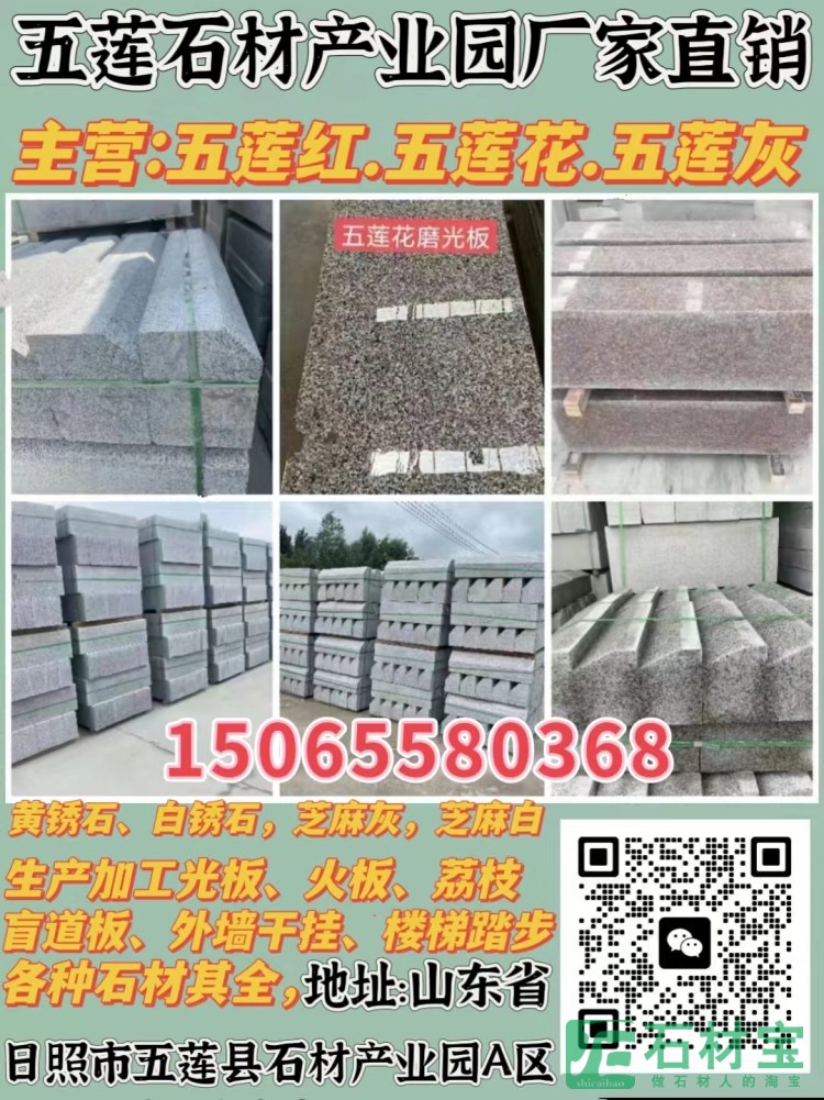 山东五连产业园欢迎你!本厂主营五莲红,五连花,五连灰,黄锈石、白锈石,芝麻灰,芝麻白、黄金麻、,芝麻黑、 染色板,生产加工光板、火板、荔枝面、拉丝面、盲道板、外墙干挂、楼梯踏步,路牙石、挡车柱、花瓶柱、桥栏板、台阶石、挡车球、门牌石、花 盆、石鼓各种异型雕等,各种 规格齐全欢迎订购,价格低,以品质赢得市场,以服务赢得客户,质量保障,微信:15065580368