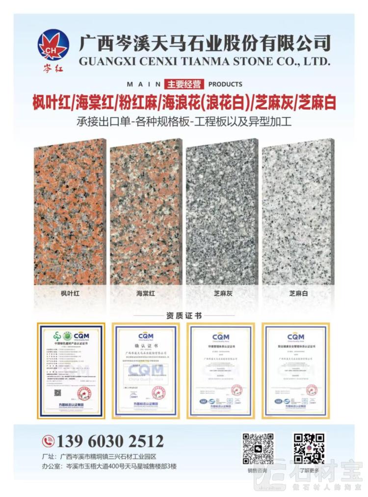 广西天马石业,厂矿一体13960302512 枫叶红,海棠红,粉红麻,海浪花(浪花白),芝麻白,芝麻灰。 承接各种规格板,工程单,出口单以及异型加工 批发各种规格毛光板,火烧板,荔枝面,拉丝面,路沿石等