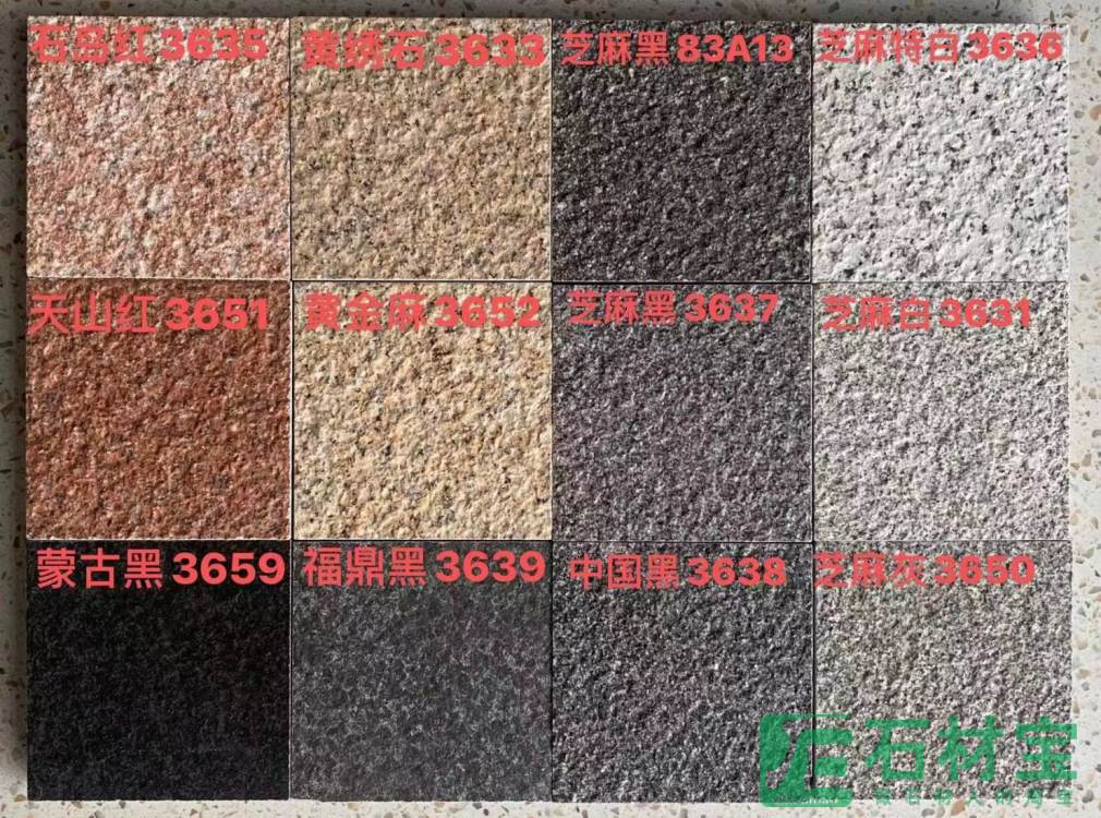 芝麻白、芝麻灰、芝麻黑、黄金麻、黄锈石、白麻、灰麻、G603、G654、G655、中国红、中国黑等