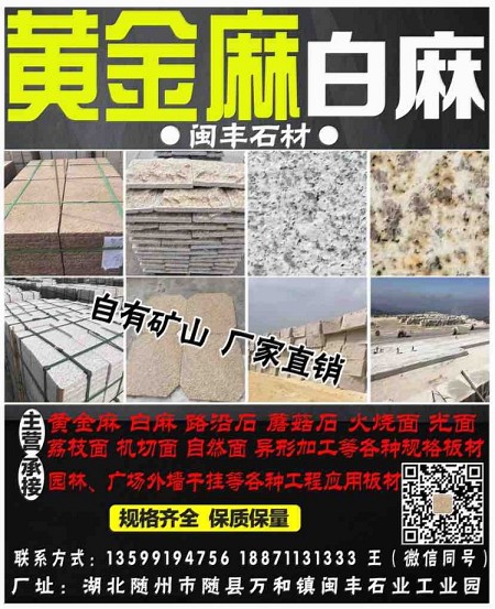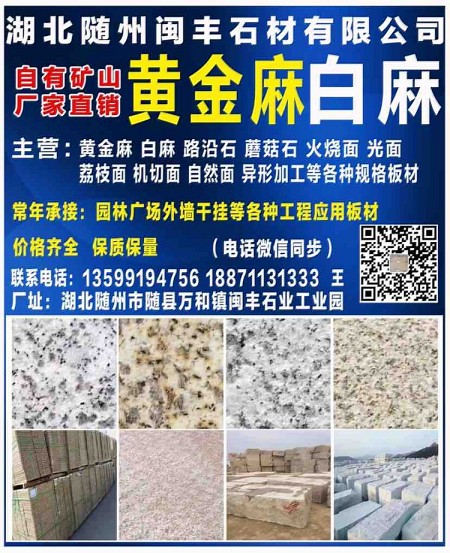 湖北随州闽丰石材有限公司 拥有矿山开采权 厂家直销 【主营】黄金麻,白麻,路沿石,蘑