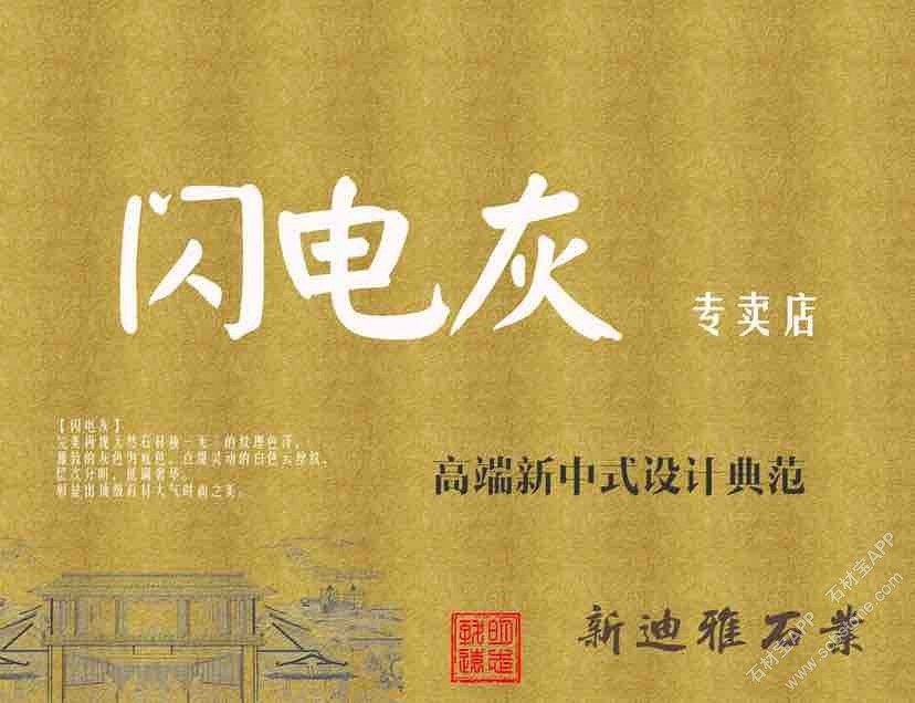 【闪电灰】结构致密,质地细腻,闪电状银丝渗入灰底中犹如夜空中的闪电,灰银两色过渡自然,相渗相容,给人自然和谐的舒适之感。