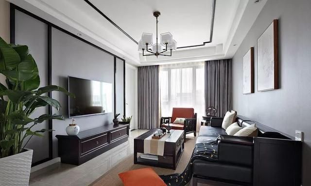 客厅整体简洁雅致的中式韵味气质,电视背景墙和吊顶都已黑色实木线条作为装饰,菱角分明,空间感极强。一套现代中式风格的沙发椅+茶几、电视柜,搭配绿植和装饰画,营造出舒适自然的气息,很有中式风的独特味道。土巴兔装修智能小程序
