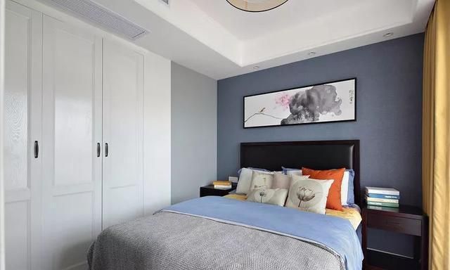 次卧原木色地板进行铺设,营造出自然温馨的气息。床头背景墙粉刷成深蓝色乳胶漆,搭配一幅水墨中式装饰画,效果特别有意境。靠墙定制一排白色通顶衣帽柜,满足生活储物的需求,超储物空间强大、超实用。