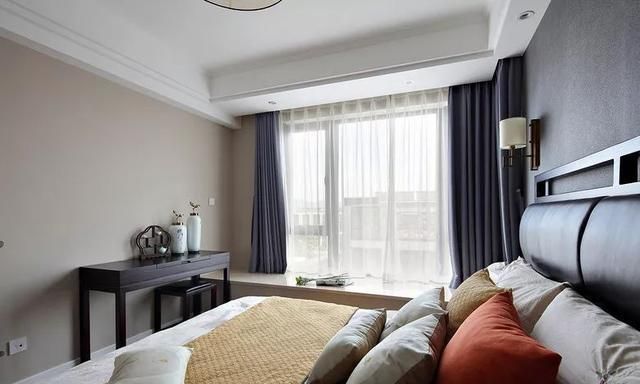 主卧空间实木地板搭配浅灰色墙面乳胶漆粉刷,顶面四周设计吊顶,提升卧室层次感。陈设一张舒适的双人大床,床头墙面安装黄铜色壁灯,进行装饰,营造出轻奢的贵气。床位角落摆放一张黑实木桌椅,可以作为梳妆台或是办公学习空间,搭配一些瓷器进行装饰,效果漂亮又实用。