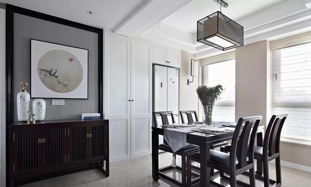 餐厅空间紧挨景观墙,正中心陈设一套长方形实木餐桌椅,看起来沉稳大方,搭配精致的餐具和插花绿植,顶面安装一盏中式吊灯,让生活更加具有情调,用餐更加具有仪式感。旁边靠墙定制一面白色通顶收纳柜,一角还预留出双开门冰箱的空间,整体效果统一又美观。
