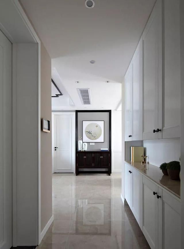 打开入户大门,正对面一眼看到的景观墙,特别的漂亮吸引眼球。深红色的实木搭配白色青花瓶的装饰,墙面在搭配一幅中式韵味的装饰画,特别雅致,一进门就能被迷住。右手边定制了一排白色实木通顶收纳柜,中间和底部都采用留空设计,便于收纳鞋子和包包、钥匙等,储物空间很充足。
