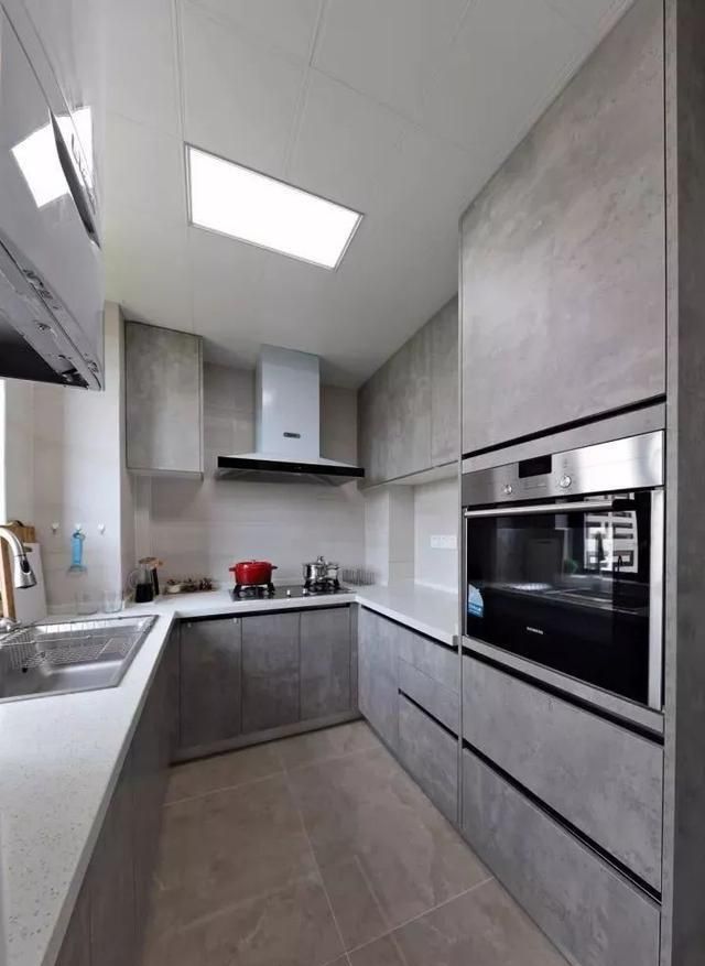 厨房空间整体以灰白色调为主的搭配,空间很宽敞,定制U型橱柜操作台+吊柜,各种厨房电器全都镶入在柜子里面,节省空间又实用,而且还提升了颜值。