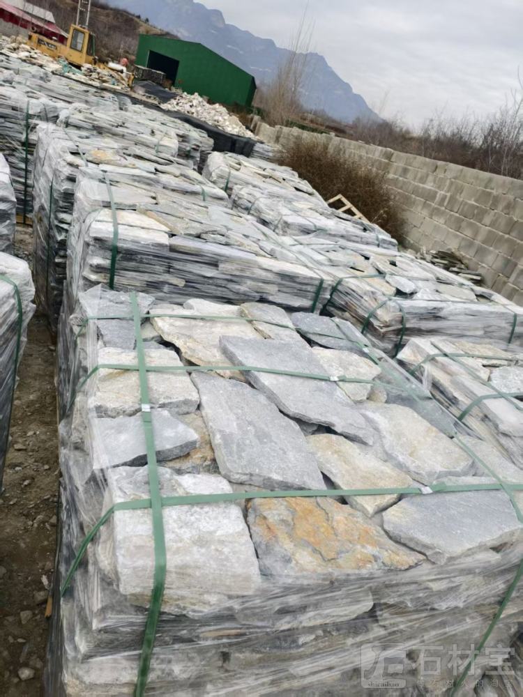 自然面碎拼石,碎片石,不规则板岩厚度3公分左右自然环保,没有辐射,不易褪色 ,硬度高,耐高低温,抗腐蚀。适用于园林景墙,私家庭院墙面,小区景墙,室内背景墙等